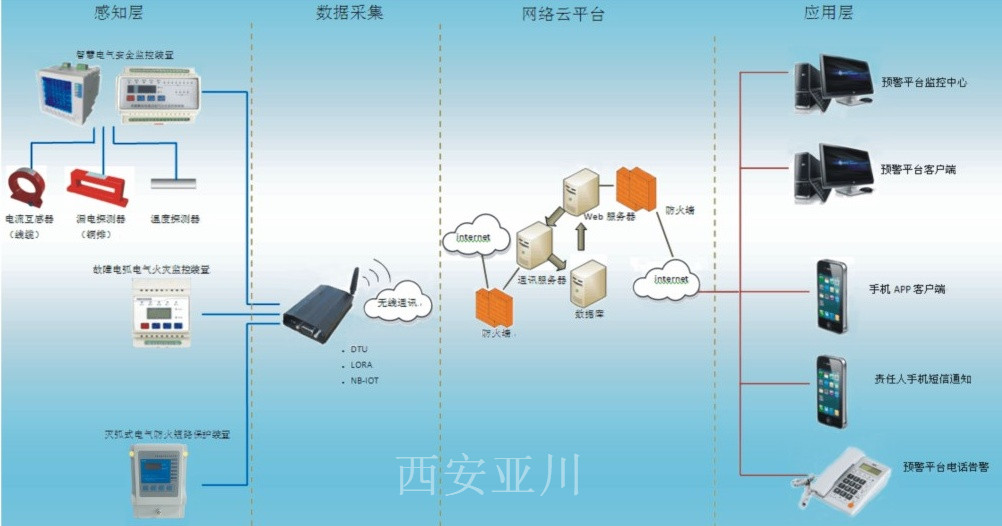 智慧式用电安全隐患监管服务系统由三大核心架构组成:智慧用电智能硬件+无线数据传输终端+智慧用电安全管理服务平台。